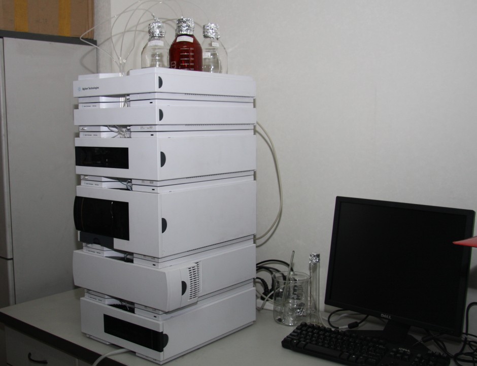 美国Agilent 1200LC高效液相色谱是我所于2010年购置的。该仪器由G1311A四元泵、G1329A标准型自动进样器、G1316A, G1316B XL柱温箱、G1315C XL DAD检测器、色谱柱Zorbax Eclipse XDB-C18 150 x 4.6 mm, 5um column等组成。DAD检测器全扫描波长范围为190nm-950nm。光源:重氢(D2)灯, 卤化钨(WI)灯。液相色谱法用途极为广泛,适用于分离低挥发性或非挥发性、热稳定性差的物质。可用于痕量分析,其检测限为ppb~ppm级。目前,我室主要着力于大气中醛酮类羰基化合物(carbonyl compounds)的研究分析。